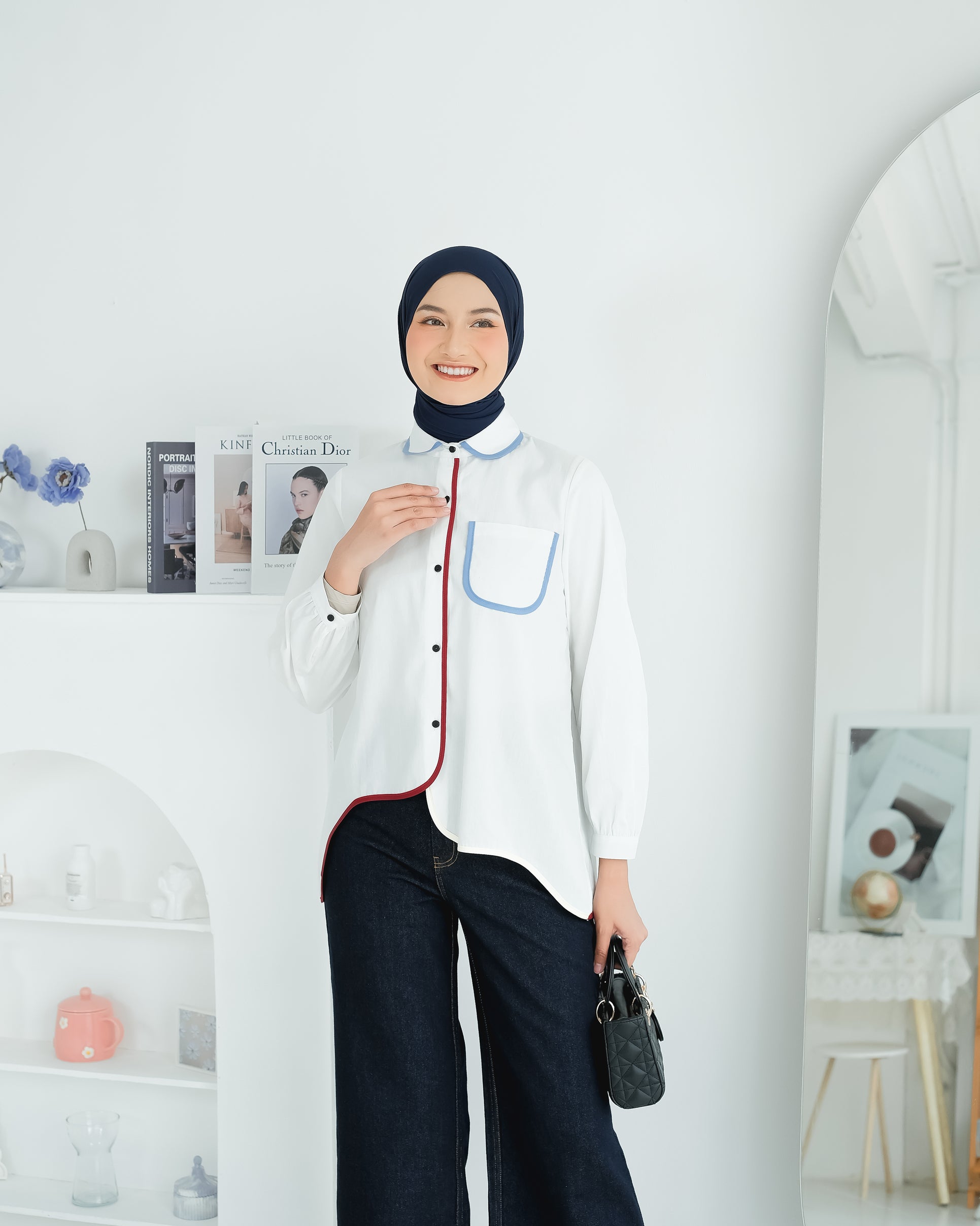 Kemeja semi formal berbahan katun dengan detail pipa kontras berwarna di tepi kerah, plaket, badan dan saku serta detail bergelombang di bagian bawah baju. Padukan dengan celana denim Nicola untuk tampilan yang sempurna.